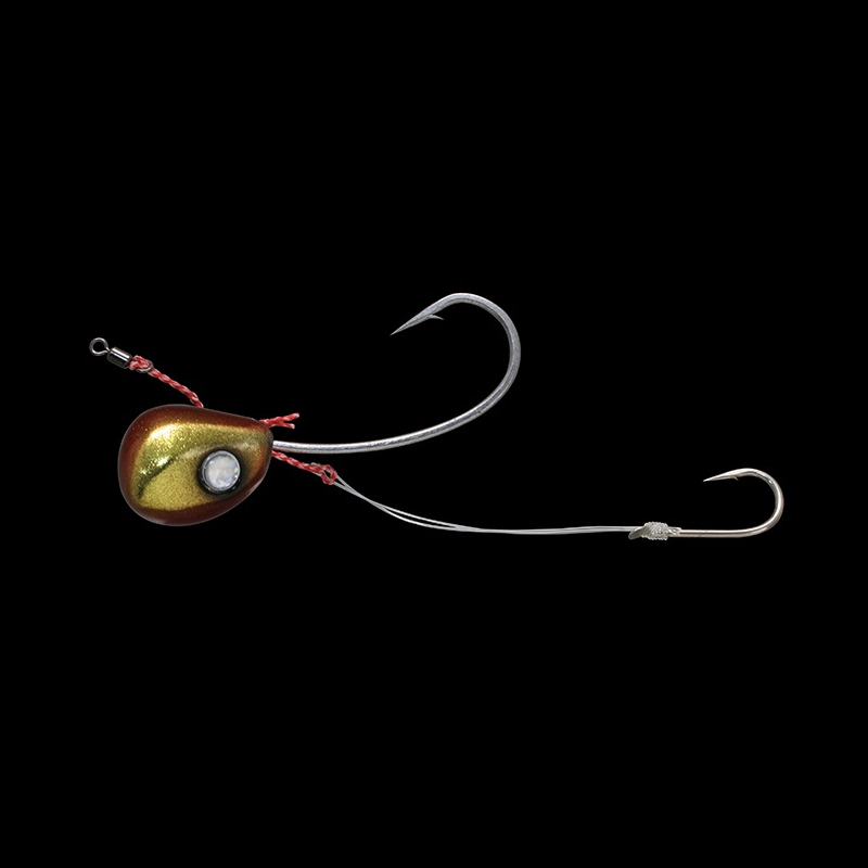 ビンビンテンヤ”鯛夢”はフロントヘビーなヘッド形状と高比重タングステン素材により、安定した沈下姿勢と抜群の沈下スピードを手に入れました。接地面が広く着底感度にも優れるため、ラインが斜めに出て底取りが難しくなる場面においても快適な釣りが可能です。テンヤをキャストし、積極的に広範囲を探っていく釣り方などでも、大きなアドバンテージを得られることでしょう。フォールから着底にかけてはエビを高く持ち上げた垂直姿勢。リフトやステイ中には水平に近い姿勢をキープし、アタリを効率良くフッキングへと持ち込むための”隙のない姿勢”を実現しています。仕様のひとつひとつにこだわりを詰め込んで誕生したビンビンテンヤ”鯛夢”。あなたのひとつテンヤゲームを頼もしくサポートしてくれることでしょう。