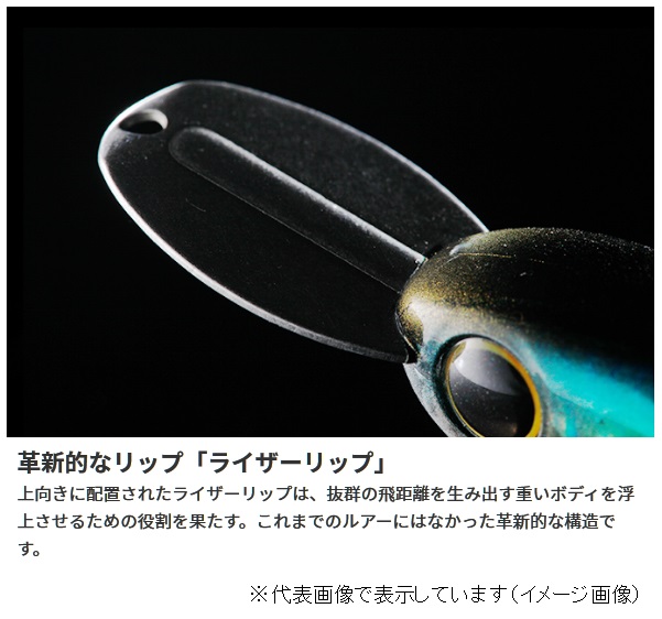 「飛ぶ→巻く→急浮上」 一番の特徴はその革新的なリップ「ライザーリップ」。これまでのミノーやシャッドのような潜らせるためのリップではなく、抜群の飛距離を生み出す”重いボディ”を水面へ浮上させる、というまったく逆の役割を担うリップです。同等サイズのトップウォータープラグでは届かなかった遠距離も射程に入れ、水面の攻略を可能にするアイテムです。008はショアからのシーバス、小型中型回遊魚がメインターゲット。遠浅の河川、干潟などシャローでのシーバスゲームから、イナッコやイワシなどベイトのボイル打ちも得意とします。また、おかっぱりからサワラやブリの幼魚(イナダ・ハマチなど)を狙う際も、ベイトフィッシュを追って水面を意識している状況では非常に有効なアイテムに仕上がっています。※掲載している商品の画像は代表画像を表示しています。また実物と色が違って見える場合があります。あらかじめご了承下さい。