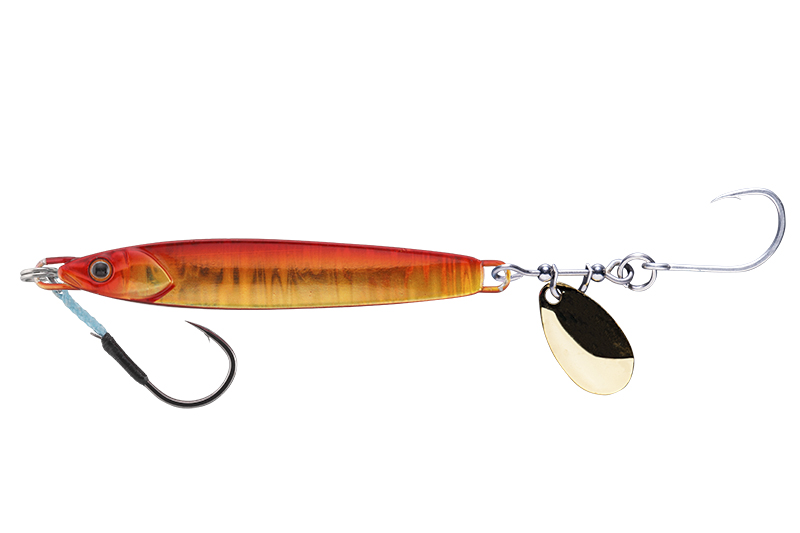 釣場、魚種は不問「ただ巻き」ブレードジグ登場!ボディーのウォブリングとブレードのフラッシングによる強アピール!さまざまな釣り場と魚種に対応、堤防からの大型回遊魚から、サーフのフラットフィッシュ、さらに岩礁帯のロックフィッシュまで多種多様な魚種と状況に対応する、高い汎用性を誇るキャスティングジグです。オートマチックにバイトを誘発、遠投してただ巻くだけで、ブレードを回転させながらボディを揺らめかせ魚を誘惑。ファーストからスローまで対応します。またフリーフォールでは、ブレードをはためかせながらヒラヒラとフォール。巻きとフォールを織り交ぜて魅了します。特徴的なブレード/フックシステム、ブレードのすぐ後ろにフックを配置するシステムにより、ブレード系ルアーでありがちなミスバイトを減らしフッキング率の向上を実現。