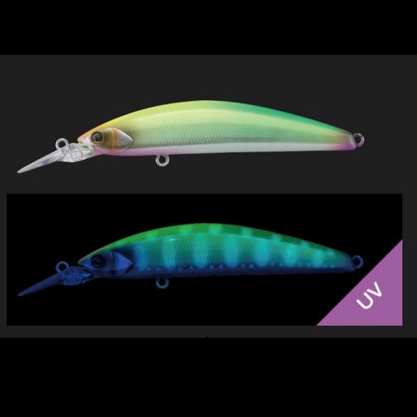 北陸で実績のあるライムチャートと、近年効果が確認されてきた紫系の組み合わせです。ウロコパターンホロの上にクリアーイエロ−を側面中央部まで吹いているため、背中側のゴールドと腹側のシルバーのコンビネーションでのフラッシングを可能に。紫系はバイトマーカーとして魚の急所である喉元からベリーとテールに配色。ローライト時にも効果のあるケイムラパーマークも採用しています。