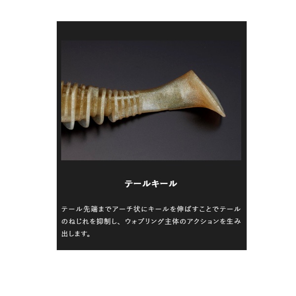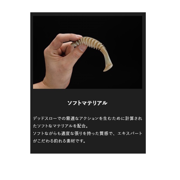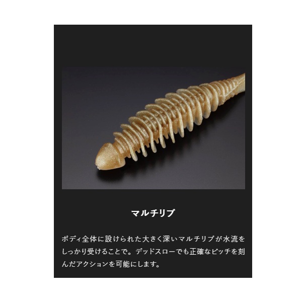 遅くて強い。リブのチカラ。●極限への挑戦。デッドスローでバイト誘発。障害物に寄り添うビッグバスを攻略するために開発されたデッドスローラーは、その名のとおりデッドスローでのアクションを追求した食わせ特化型のシャッドテール。しっかりテールを動かしてバイトを誘発します。●水を掴んで離さないマルチリブ。水に対する抵抗を最大限生み出すよう設計されたマルチリブ。水流をボディー全体に纏わりつかせ、デッドスローでもウォブリングする、安定したアクションを生み出します。