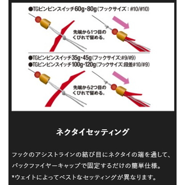 ヘッド、スカート、ネクタイが一連の従来の漁具型ルアーと異なり、ボディとネクタイ+フックを別パーツとして構成。さらに並列にセットしボリューム感を抑えたことでコンパクト化を実現。ボディへのバイトもフッキングに持ち込みます。二枚潮をつき抜ける直進性能。流線型ボディをぶら下がり式にセッティング。水の抵抗を抑えた整流効果によって潮流に負けない速いフォールとファストリトリーブでもバランスを崩さず安定したアクションを可能にしました。マダイ、ブリ、ヒラメ、アコウやカサゴなどのロックフィッシュまで、幅広いターゲットでオフショアゲームを楽しくします。