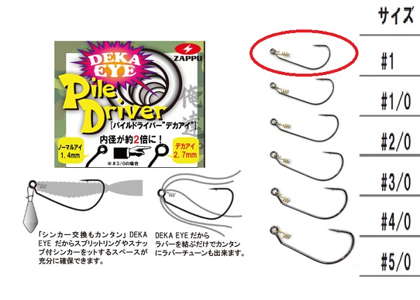 パイルドライバー” デカアイ” ZAPPU× ダウザー俺達。 大人気のパイルドライバーから、アイが約2 倍になったデカアイバージョン登場! 「ラインアイがでっ かくなると…なにかが起こる?!」そうです!ラインアイが大きくなると、ラインを結びやすいのは勿 論のこと、アイ部分にスカートを巻いてチューンしたり、、、色んなチューンがあなたの想像次第で完 成します。オススメは、「アイショット」シンカーとのコンビ!アイショットシンカーをノーマルのパイル ドライバーに装着すると、ラインアイの部分でシンカーのスクリュー部分とメインラインが干渉してしま います。しかし!このパイルドライバー” デカアイ” を使用すると、、干渉する心配もございません♪ ぜひこの「パイルドライバー” デカアイ”」を「アイショット」と組み合わせてリグしてみてください♪ ※掲載している商品の画像は代表画像を表示しています。また実物と色が違って見える場合があります。あらかじめご了承下さい。