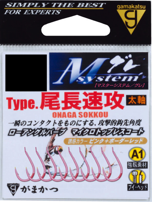 一瞬のコンタクトをものにする、攻撃的鈎先角度。1.75?2.5号クラスの竿で尾長グレを狙うのに最適な強度とサイズ設定の「尾長専用鈎」。ごくわずかなネムリを持たせた攻撃的な鈎先角度は、大型尾長の一瞬のコンタクトをもモノにし、唇に大きな進入角度で鈎先を立たせ、歯切れを防ぎます。