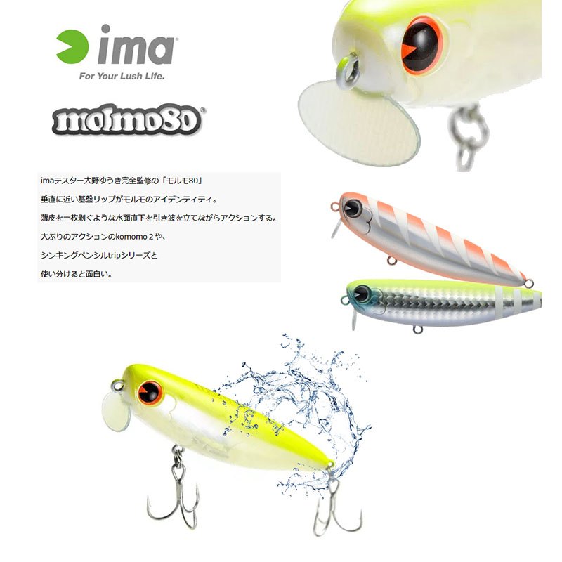 湾奥のプリンスこと大野ゆうき氏完全監修ミノー 流れの利かなくなった時間帯やベタナギ無風などの、タフコンを打開するというコンセプトで開発されたモルモ80。安定した飛距離で、大きすぎず小さすぎない程よいウォブンロールアクションを発生。着水直後の立ち上がりが素晴らしく、水面直下(0〜20cm)を安定してキープ。最大の特徴は、スローリトリーブで発生する水面直下の“薄皮一枚を剥ぐような独自の引き波。年間1tの水揚げを誇る大野ゆうきが渇望し、造りあげたコダワリのセッティング、これにはスレきったターゲットもたまらず口を使ってしまう。使用ステージは港湾・河川・干潟までと幅広く、引き波の大きなkomomo IIとの使い分けで高い戦略性を発揮します。