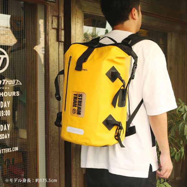 DRY TANK 33L D2は、25Lと40Lの中間の大きさで、もう少し容量が欲しいと言った声にお答えしたミディアムサイズのバックパックです。DRY TANK D2シリーズは抜群の防水性能を誇るストリームトレイルのベーシックなバックパックです。防水バッグに使用されている表面素材の《ターポリン》は、ポリエステル系の繊維を合成樹脂フィルムではさんで溶着したものです。テントやよく街で目にする屋外広告の横断幕、工事現場などでも使われており、水に強く、過酷な状況下でも裂けたりしにくく、摩擦にも強い生地となっています。水の入りやすい開口部は、防水加工を施したフラップをロールダウンすることにより抜群の防水性能を発揮するとともに、ロールしやすい柔らかい生地を採用しています。多少の汚れでも簡単に拭き取ることができるため、手入れもしやすいため、フィールドにもタウンにも使用いただけます。