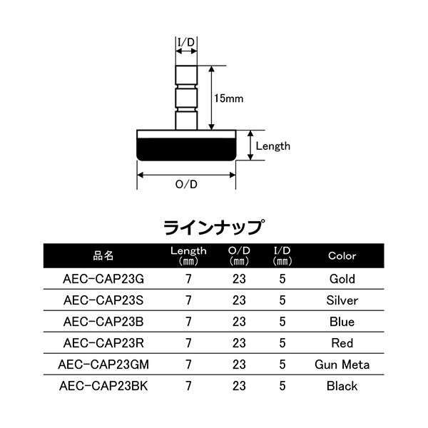 アルミエンドキャップ。アルマイト加工された底面ラバー仕様(黒部分)の軽量アルミエンドキャップです。アルミパーツでカラーを合わせやすいので、デザイン性に富んだカスタムロッドが製作可能。フロントリールシートリング(FRRA-16)やエンドキャップリングを間に入れると、よりアクセントを出すことも可能です。※注意事項 サイズ・重さに多少誤差がございます。