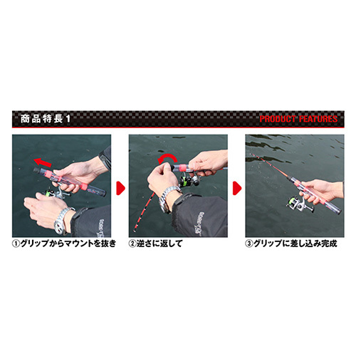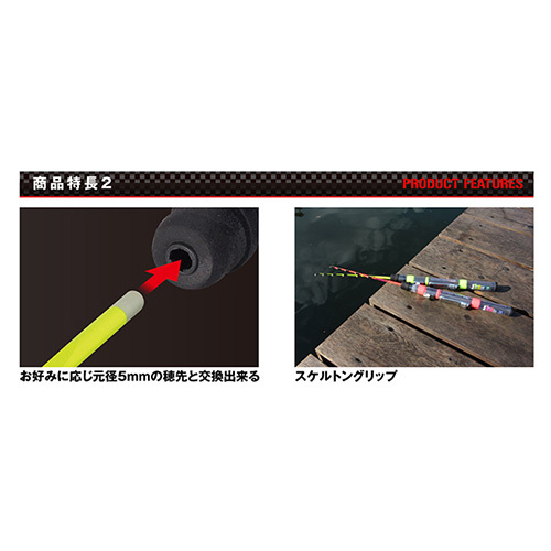 お好みに応じ、穂先が交換できる!グラス製扁平穂先を使用したドーム船、氷上釣り対応のワカサギ専用ロッド。オリジナルマウントシステムで元径5mmのお好きな穂先に交換出来ます。斬新なデザインのスケルトングリップは収納時の穂先の保護にも役立つ優れもの。使用時はグリップ内に収納した穂先を取り出し逆さに継ぐだけ。付属の穂先は感度の良い扁平グラスソリッドを採用。アクションはSSSアクションとSアクションの2ラインナップ。