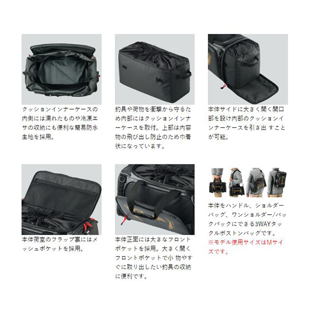 ●本体生地に雨やシブキが染み込まないP.V.C 素材が採用されたタックルボストンバッグ。中身も水に強いシンプル設計のため、釣行後のお手入れも簡単に行えます。●本体サイドに大きく開く開口部を設け内部のクッションインナーケースを引き出すこともでき、ワンショルダー/ バックパックで持ち運ぶ際にはそこから内部にアクセスできます。●ショルダーパッド付きで、その裏面には肩にしっかりフィットする滑り止め仕様。【ご使用上の注意】●本体及びパーツへの過度の衝撃を与えないでください。 ●取っ手及びショルダーベルト使用時に、本体に対して90度以上の方向への引っ張りは避けてください。破損の原因につながります。●製品保管時に、直射日光を避け、日陰で風通しの良い場所での保管をしてください。直射日光、高温多湿の場所での保管は製品の色褪せ、各部材の劣化につながります。●ご使用後は必ず真水での洗浄をしていただき、十分に乾燥させてから保管をお願いいたします。※海水が付着したままでの保管は本体の劣化、ファスナー部分の固着の原因になります。