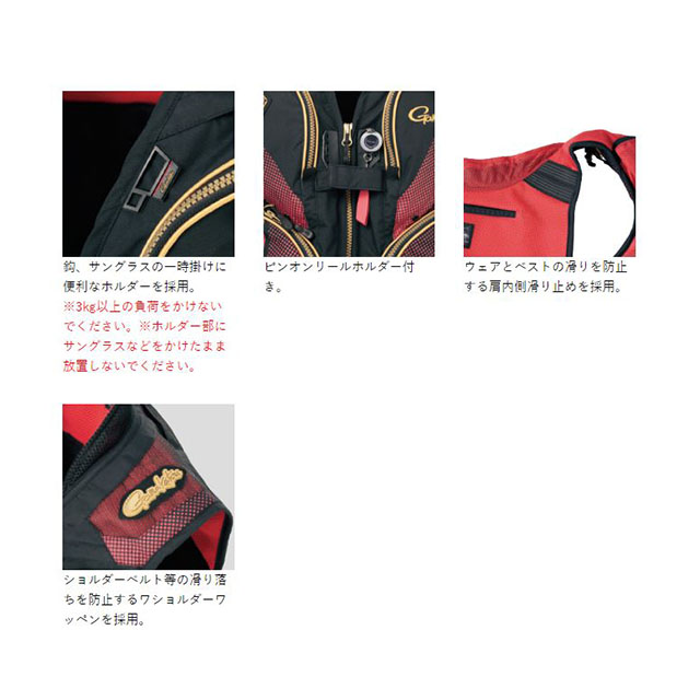 ●水を吸収しにくい本体素材を採用し、水やシブキを寄せ付けず、濡れても素早く乾燥します。●本体が保水しないため、瀬渡り時の抵抗も少なくなり、ベスト自体が重たくなるのを防ぎます。●フロントポケットに多くの荷物を入れても、荷重が1 点に集中することを防ぐ特殊裁断パターンを採用しました。●フロントの胸ポケット、腰ポケットともに同仕様にし、製品本体・縦横方向への安定性を向上させました。腰ポケット表には、小物が入る小分けポケットを装備。●ファスナー部分には、スムーズに開閉が可能なコシのあるパイピングを採用しました。●左右の胸ポケット上部には上栓ポケットを装備。●右胸ポケット内側にはD カンを装備し、尻手ロープと組み合わせることで内容物の落下を防止します。●首裏部に財布などを収納できるファスナー付きポケットを装備。●ドットボタンを留めるとフロントファスナーを閉じなくても、ポケットファスナーの開閉が行えます。●肩内側にベストのズレを防ぐ滑り止めテープを装備。●裾部にはフィット性を高める調整コードを装備。●開閉しやすい両引きスライダーを搭載。●背中生地は刺繍、プリントなどが入れやすい取り外し仕様。