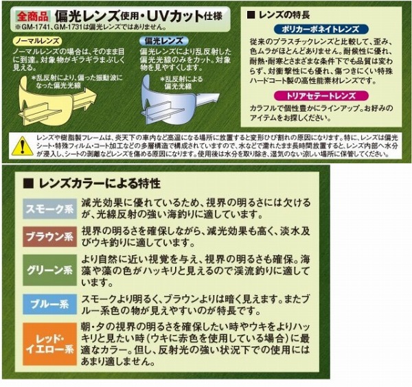 ●フレームにカーボン柄をアクセント。スポーティでありながら重厚感のあるデザインに仕上げました。〈スモーク〉オールマイティレンズ。晴天時の厳しい光を抑制することで、目に与えるダメージを抑え長時間の釣行でも負担を低減します。真夏の強い日差しを遮るだけでなく、真冬の朝マヅメ・夕マヅメで太陽の角度が低くギラつきの強い時間帯にも、水面の些細な動きを捉えることを可能にします。〈アクアブルーミラー〉光で輝くアクアブルーミラーをコートしたスモークレンズ。オールマイティなスモークレンズとほぼ同等の視界を確保しつつ、レンズにミラーコートを施すことにより、よりクールでスポーティな印象を与えます。※ミラーコートは表面のコーティングであり車内などの高温多湿の状況に放置すると劣化し剥がれる原因となる恐れがあります。鋭利なもので擦ったりしないでください。