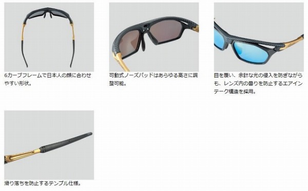 ●フレームにカーボン柄をアクセント。スポーティでありながら重厚感のあるデザインに仕上げました。〈スモーク〉オールマイティレンズ。晴天時の厳しい光を抑制することで、目に与えるダメージを抑え長時間の釣行でも負担を低減します。真夏の強い日差しを遮るだけでなく、真冬の朝マヅメ・夕マヅメで太陽の角度が低くギラつきの強い時間帯にも、水面の些細な動きを捉えることを可能にします。〈アクアブルーミラー〉光で輝くアクアブルーミラーをコートしたスモークレンズ。オールマイティなスモークレンズとほぼ同等の視界を確保しつつ、レンズにミラーコートを施すことにより、よりクールでスポーティな印象を与えます。※ミラーコートは表面のコーティングであり車内などの高温多湿の状況に放置すると劣化し剥がれる原因となる恐れがあります。鋭利なもので擦ったりしないでください。