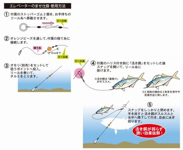 堤防で手軽に大物ハント!仕掛を投入後、活き餌を送り込むエレベーター釣法なので、 抵抗なく沖のポイントまで遠投可能。活き餌が弱らず元気に長持ち!※掲載している商品の画像は代表画像を表示しています。また実物と色が違って見える場合があります。あらかじめご了承下さい。