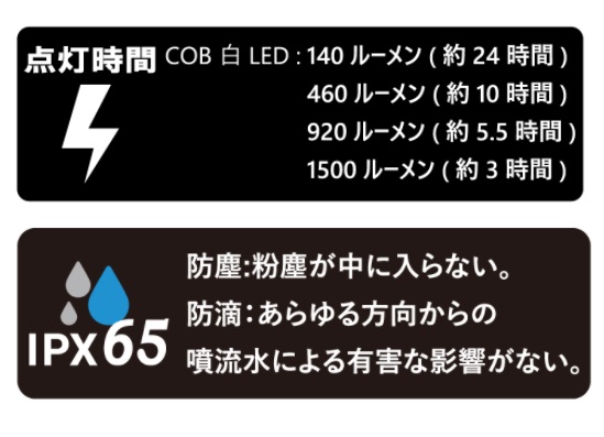 ・バッテリー残量表示付き。・USB 出入力5V 1A。・20W白色COB LED。・クイックオフ機能(3 秒後以降に1 回押せばオフ)。・メモリーライト機能(前回使用のライトから点灯)・フル充電時間:6-6.5時間