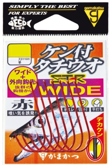 「ワイド」+「外向き鈎先」による抜群の鈎掛かり!コンタクト性を高めた攻撃的な鈎先が、低活性時の喰い渋りや「止め」の際に出る小さなアタリも瞬時にフックアップ。エサのズレを防ぐ「デカケン」仕様。タチウオの喰い気を誘発する「赤」