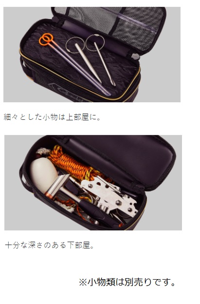 ・小物をまとめてスッキリ収納することができ、分別収納に便利な2層構造のポーチです。・磯(底物)ピトン、ハンマー、ハーケン、ウニ通しなどをまとめてコンパクトに収納が可能。・天面のメッシュポケットにも小物が収納可能。・メッシュ製なので、内部が確認しやすく、湿気がこもらず内部の金属製品にも優しい設計。※錆の発生を防止するものではありません。