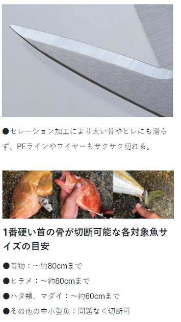 魚の下処理からラインカットまでこれ1本でOK!!●全長70mm、厚さ3.8mmの極厚ブレードで大型魚のヒレや骨もラクラク切断可能。●安全面も考慮したセーフティロック搭載。●サビに強いオールステンレス仕様。●滑りにくく、力の入れやすいエラストマーグリップ。
