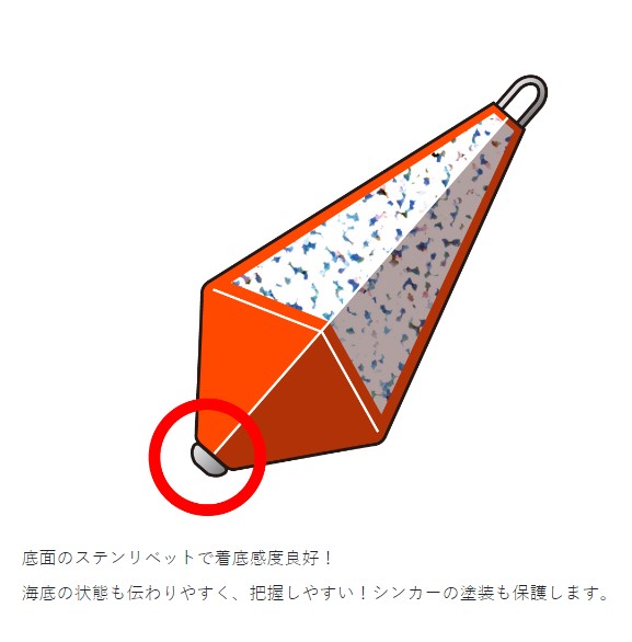 「競技」の名にふさわしいカワハギ専用シンカー!水切りの良いフォルムと大きなフラット面が、キレの良いヒラ打ちと強烈なフラッシング効果を生みだします。また、底部のステンレス・リベットが着底感度を増し、底質の感知能力も抜群です。