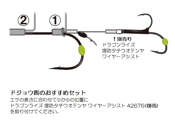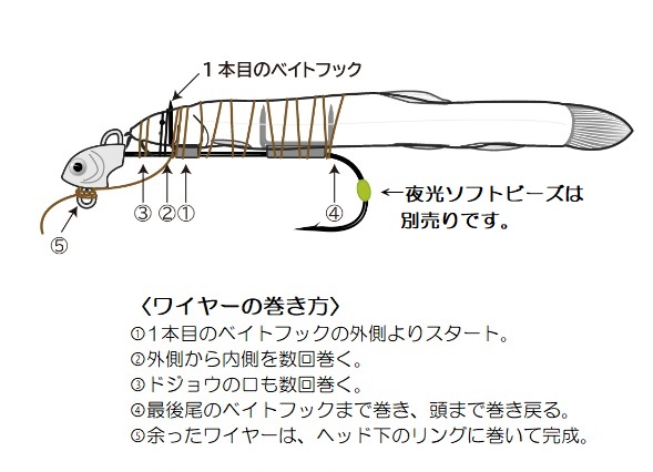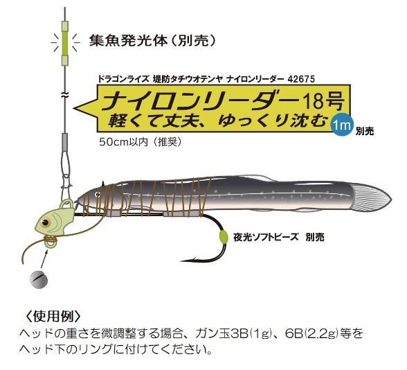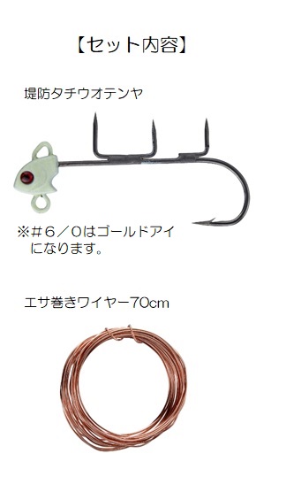 餌をできるだけ水平にゆっくりと沈め、ゆっくり誘う。とにかく繊細な最先端の堤防タチウオテンヤ釣り。実釣を重ね行きついたヘッドバランス。上部に付いた三角アイが水平バランスに保ってくれます。フックは軸太タイプで安心の強度、そして餌の大きさに合わせて選べる2サイズのロングシャンク仕様。餌巻き銅線は長めの70cm付きで大きめ、長めのエサでもしっかり巻けます。餌がキビナゴならこのままで、ドジョウなら別売のワイヤーアシストを付ければ最高のコンビとなります。セット内容●堤防タチウオテンヤ●エサ巻きワイヤー70cm