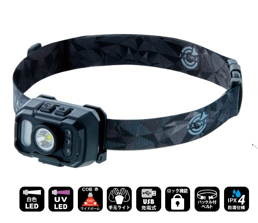 強力白色LEDモデル。◆バッテリー残量表示付き。◆クイックオフ機能(3秒以降に1回押せばオフ)。◆メモリーライト機能(前回使用のライトから点灯)。◆USBタイプC。◆激しい動作でも角度がズレにくい新プレート採用。◆白色LED手元ライト(14ルーメン)。