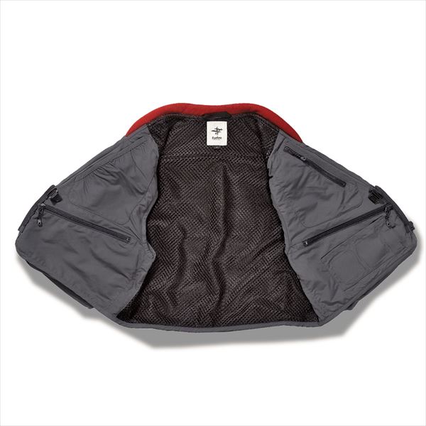 収納力の高さが際立つフィッシングベスト。左右腰部のポケットには大型プラグを収納するために多用される205×145mmサイズのケースが収納可能です。胸部にはデジタルカメラや小物ケース、リーダー類を余裕をもって収納できるポケットを配置。近年大きくなりつつあるスマートフォンの出し入れもスムーズに行えます。さらには前面の各ポケットを活用することにより、186×103mmのLサイズケースを最大で6個まで収納することができます。左身頃の内側にはラインの切れ端などを入れられるダストポケットを配置。背面は、上部に500mlクラスのボトルを収納でき、メインポケットにはレインジャケットや仕舞寸法40cm程度までのパックロッドを収納できるスペースを確保しています。また、着用している衣類と接しやすい箇所のベルクロを極力減らすことにより、レインジャケットの袖口との干渉を防いだり、内側に着用しているシャツの生地を傷めないように考慮しました。スプーン等の重量物を持ち運ぶ際にも肩への負担を軽減すべく、荷重分散を徹底追求した新パターンを採用。