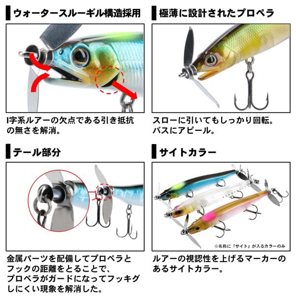ウォータースルーギル構造搭載投げて巻くだけのシンキングプロップベイト。投げて巻くだけで魚を引き寄せるシンキングプロップベイト。表層付近をスローに引くことができ、かつベイトフィネスタックルでも十分な飛距離を稼げるように設計。ヘッド部分にはウォータースルーギル構造を採用し、ノー感じになりやすいプロップベイトにわずかに引き抵抗をプラス。集中して使用できるプロップベイトに仕上がっている。極薄に設計されたペラはスローに引いてもしっかり回転してバスにアピール。テール部分には金属の筒状パーツを配備してペラとフックの距離をとることで、ペラがガードになってフッキングしないという現象を解消。フック自体はサクサスフックを搭載し、ショートバイトもからめ取っていくことが可能。ゆっくり巻くのが苦手な初心者でも使いやすいファストシンキングモデル。※掲載している商品の画像は代表画像を表示しています。また実物と色が違って見える場合があります。あらかじめご了承下さい。