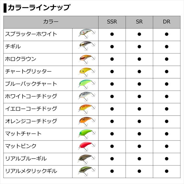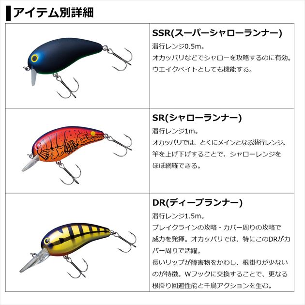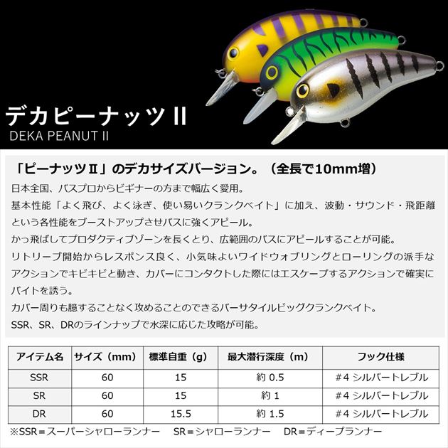 よく飛び・よく泳ぎ・よく釣れるバーサタイルビッグクランク。日本全国、バスプロからビギナーの方まで幅広く愛用されている国民的クランクベイト「ピーナッツ2」のデカサイズバージョン。「よく飛び、よく泳ぎ、使い易いクランクベイト」という基本性能はオリジナルのピーナッツ2と同じながらも全長で10mm増したビッグボディにより波動・サウンド・飛距離という各性能をブーストアップさせバスに強くアピール。かっ飛ばしてプロダクティブゾーンを長くとり、広範囲のバスにアピールすることが可能。リトリーブ開始からレスポンス良く、小気味よいワイドウォブリングとローリングの派手なアクションでキビキビと動き、カバーにコンタクトした際にはエスケープするアクションで確実にバイトを誘う。カバー周りも臆することなく攻めることのできるバーサタイルビッグクランクベイト。潜行レンジ水深0.5mまでの「SSR=スーパーシャローランナー」、1mまでの「SR=シャローランナー」、1.5mまでの「DR=ディープランナー」のラインナップで水深に応じた攻略が可能。