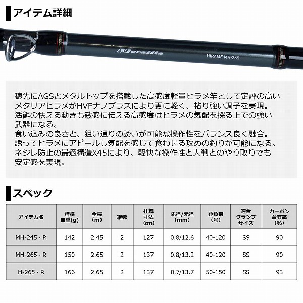 メタルトップならではの繊細な穂先でわずかなモタレを捉える!穂先にAGSとメタルトップを搭載した高感度軽量ヒラメ竿として定評の高いメタリアヒラメがHVFナノプラスにより更に軽く、粘り強い調子を実現!■手元まで響く高感度 メタルトップ採用!■穂先部『AGS』(オールSiCリング)■ネジレ防止の最適構造 X45 軽快な操作性と大判とのやり取りでも 安定感を実現■軽量・高感度エアセンサーシート リールシートに最適な軽さと高剛性、高強度を 追求したカーボン強化樹脂を採用 軽さと剛性の両立により 感度に優れたリールシート■繊細な穂先で気配を感じて食わせる 攻めの釣りが可能