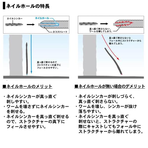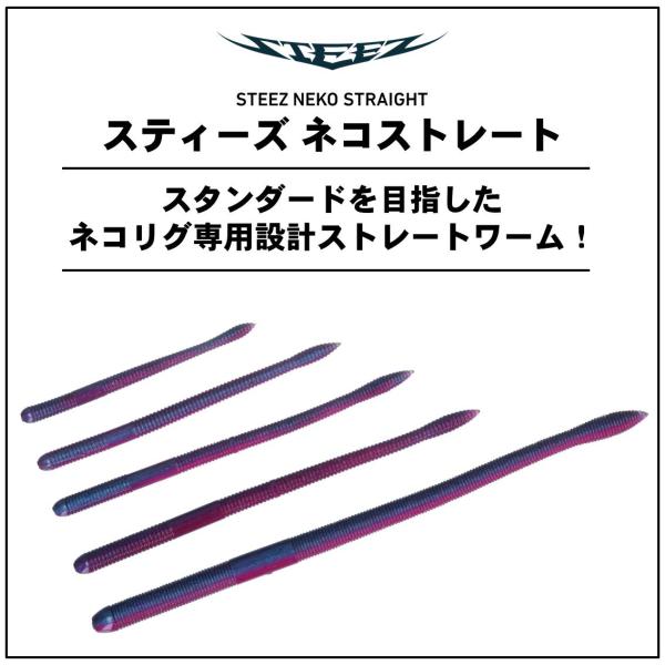 スタンダードを目指したネコリグ専用設計ストレートワーム。■ネコリグで爆発的な釣果を叩きだすストレートワーム。ネイルシンカーを快適に使用するためのネイルホールを搭載。マテリアルは、張りのあるものを採用。反発力のあるマテリアルは、アクションすることで強い水押しを発生させ、アピール力が高い。シェイクせずとも引っ張るだけで左右へのウォブリングアクションを演出。何かにスタックし、外れた時にこのアクションが生まれ、リアクションバイトを誘発する。※掲載している商品の画像は代表画像を表示しています。また実物と色が違って見える場合があります。あらかじめご了承下さい。