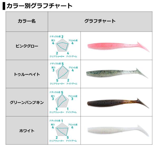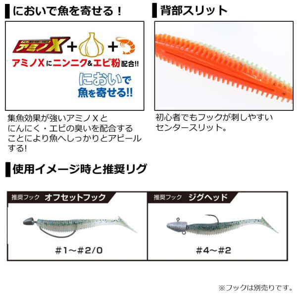 ロックフィッシュ全般に対応!ハイレスポンスアクションの小型シャッドテールワーム。■アミノX+にんにく+エビ配合で魚を寄せる。集魚効果が強いアミノXとにんにく・エビの臭いを配合することにより魚へしっかりとアピールする。■背部スリット。背部にスリットを入れることによりジグヘッドであれば中央にしっかりとフックを合わせ真っ直ぐ刺すことが可能。オフセットフックであれば針先をしっかりと隠すことが出来、根がかりのリスクを減らす。※掲載している商品の画像は代表画像を表示しています。また実物と色が違って見える場合があります。あらかじめご了承下さい。