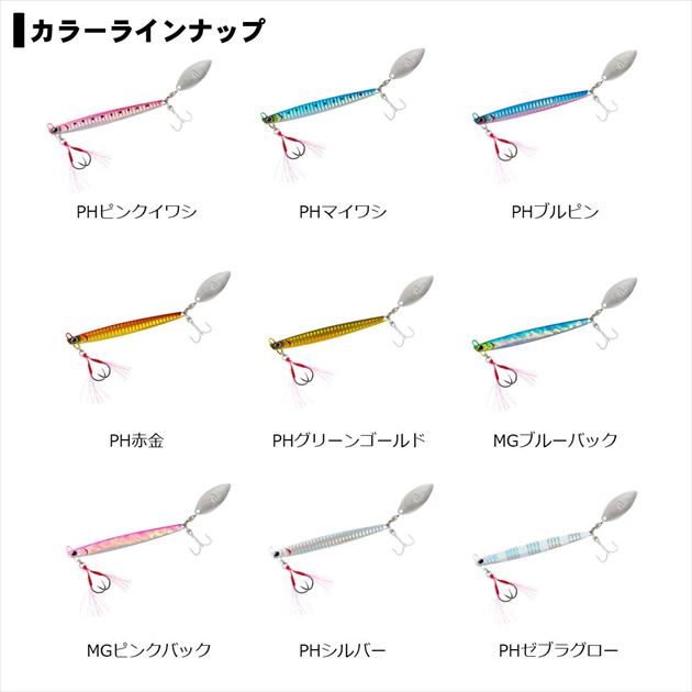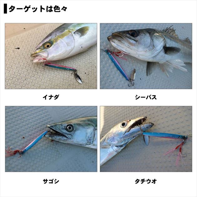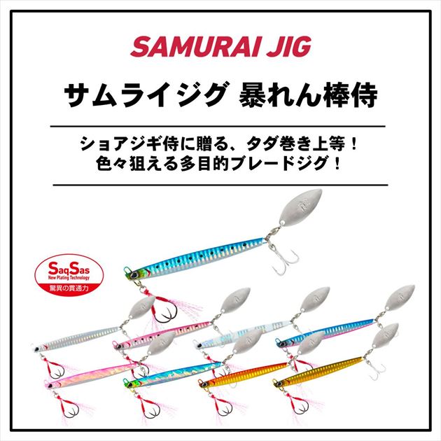 ショアジギ侍に贈る タダ巻き上等!色々狙える多目的ブレードジグ!このジグが目指したのは誰でも簡単に巻くだけで釣れる性能。他に類を見ないスリムロングボディ形状はターゲットに違和感を与えずバイトへと至らせるとともに、サゴシやタチウオなどの歯が鋭い魚にリアブレードのフックを丸呑みにされた場合でもリーダー部へのダメージを最小限に抑えることが出来る。ブリ、タチウオ、サゴシ、マダイ、キジハタ、カサゴ、イサキなどなど、様々なターゲットを狙えるお手軽ジグ「暴れん棒侍」が全国各地で暴れまわる!