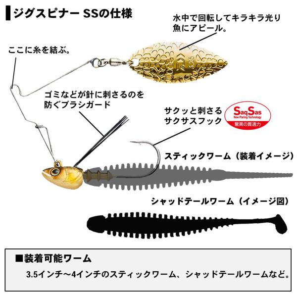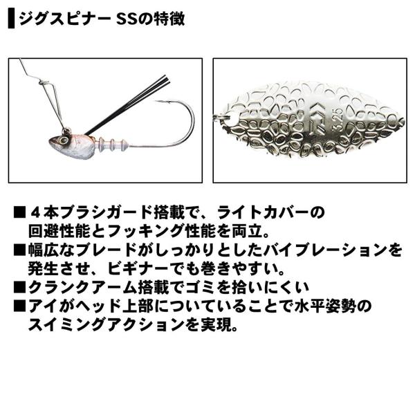 投げて巻くだけコンセプト。根掛りの少ないブラシガード付きジグスピナー。■4本ブラシガード搭載で、ライトカバーの回避性能とフッキング性能を両立 ■幅広なブレードがしっかりとしたバイブレーションを発生させ、初心者でも巻きやすい ■クランクアーム搭載でゴミを拾いにくい ■アイがヘッド上部についていることで水平姿勢のスイミングアクションを実現※掲載している商品の画像は代表画像を表示しています。また実物と色が違って見える場合があります。あらかじめご了承下さい。