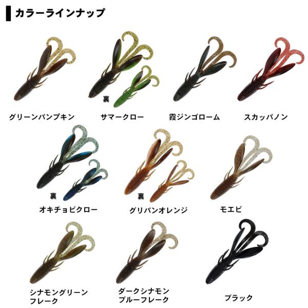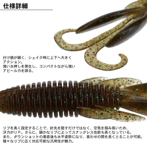 ヘビーダウンショット、ジグトレーラー、テキサスリグ、フリーリグなどに対応したサイズ感。マテリアルは、オリジナルサイズの3inch.と比べやや硬めの設定。カバー周りでのハードな使用にも対応できるマテリアルとしている。塩の量は、多すぎず少なすぎない設定。塩の量が多いと、カバー周りでのハードな釣りの際、針もちの悪さがストレスとなる。塩が少ないとパドルアームの水押しが小さくなり、アピール力に欠ける。そのバランスを取ったマテリアル設定となっている。ボディ形状は単純な等倍による大型化を行わず、リグに合わせた専用設計。水押しを強めるため、パドルアームを大型化。塩の量もUPしたことにより、パドルアームが上下に動いたときの水押しがUP。よりアピール力を持たせたデザインとなっている。※掲載している商品の画像は代表画像を表示しています。また実物と色が違って見える場合があります。あらかじめご了承下さい。
