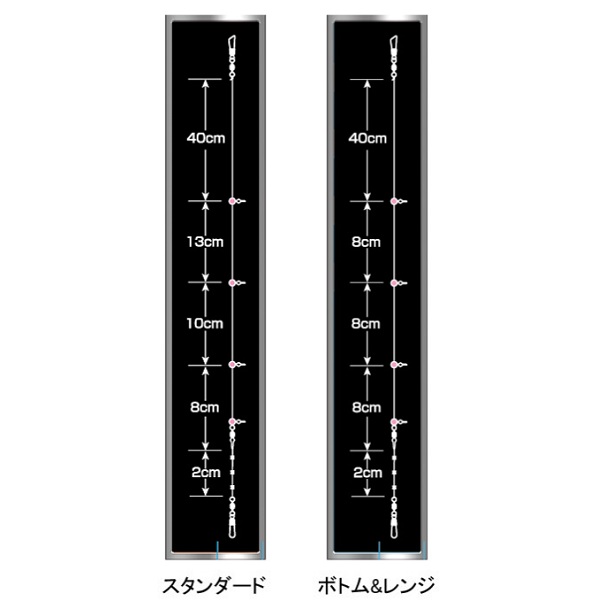 林良一テスター監修!各部にこだわりの詰まったカワハギ幹糸仕掛け。あらゆる状況に対応できるスタンダードモデルと、エダス間隔を集中化させてエサを集中させて底や宙を集中攻撃可能なボトム&レンジの2種類を用意。エサ取りや活性に合わせてハリスの止める位置を変更できる4点ビーズ仕様。より低抵抗重視の快適フックビーズを使用。根掛かりから仕掛けを守る捨て糸仕様。(ハリス止めで糸に傷が付き切れないように予備のコブ付き)捨て糸はコブが3個入り、約2時間ぐらいでコブの位置をずらすと1日釣りが楽しめます。※同じ位置で長時間使用すると早く捨て糸が切れる可能性がありますのでご注意ください。適度なハリがあり、扱いやすいフロロカーボンライン(Dフロン船ハリス)を幹糸・ハリスすべてに使用。