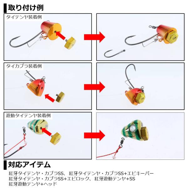 糸を切らずに簡単ウェイトアップ! ■ダイワ紅牙タイテンヤシリーズに取り付けることが出来るウェイトアップパーツ。ひとつテンヤ釣法において潮流や水深に応じてテンヤの号数を切り替えるシーンに大変便利なアイテムになります。ネジ式のシンカーをテンヤ・カブラ・遊動テンヤにネジ込むだけで1〜2号まで簡単ウェイトアップが可能。地合を逃したくない!テンヤを結び直す時間が惜しい!そんなシーンで大活躍します。澄み潮にはケイムラカラーをオススメ。※掲載している商品の画像は代表画像を表示しています。また実物と色が違って見える場合があります。あらかじめご了承下さい。