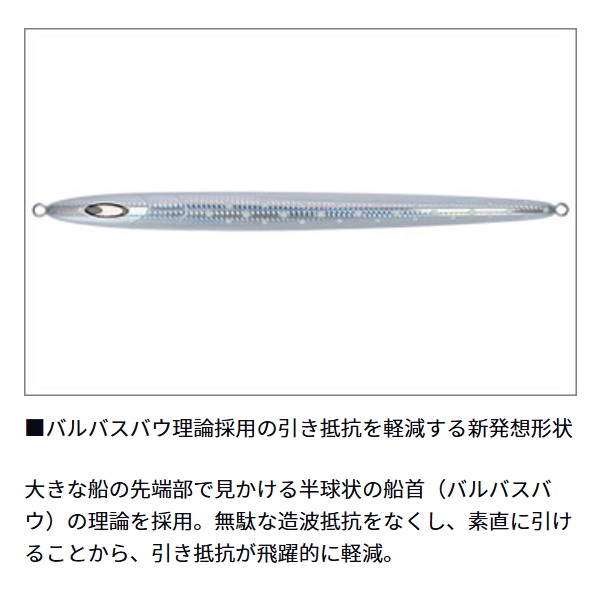 スーパーディープも制するセミロングタイプのスロージグ。中深海におけるスロージギングシーンにおいて、特に強烈な水圧とその中で安定したジャークを繰り出す為には、アングラーの負荷を出来るだけ抑えたいという要望をうけて開発。セミロングタイプの形状に加え、スーパーディープを意識したことから、水を受ける先端部分の形状を半球状にし造波抵抗を軽減した、バルバスバウ理論搭載の入魂の逸品。さらに安定したジャーク&フォールを繰り出す為に細部にわたり細かい削り込みをフィールドで施し、同船したスロージギングの名手をもうならせたことも付けさせていただきたい。