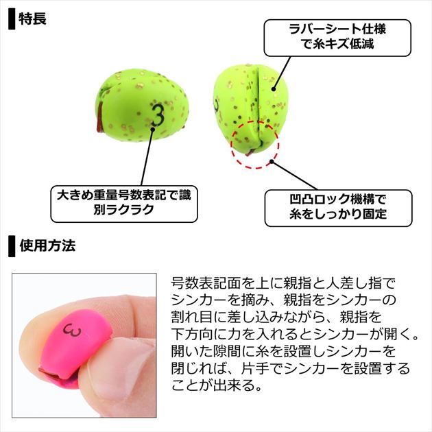 糸をしっかり固定するラインロックシステム搭載!●着脱可能のガン玉型オモリ ●細かいセッティングが可能な0.8号を追加。●船釣り用「中オモリ」として、主にカワハギやマルイカに最適。●集魚効果のある「夜光ラメ」と「ケイムラピンク」をご用意。