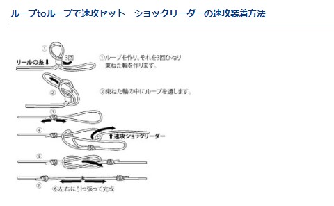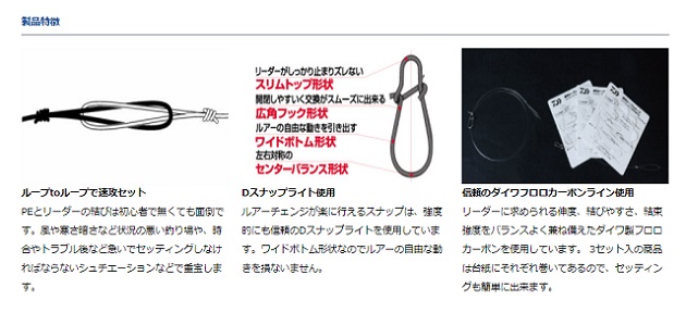 簡単で素早いセッティング! 面倒なリーダーノットを解決するDスナップライト付ショックリーダー。●リーダー結びが苦手なルアーマンに朗報。ループTOループで、誰でも速攻で簡単にセッティング出来ます。●ルアーチェンジが簡単に行えるスナップ付き。スナップはルアーの自由な動きを損なわないワイドボトム形状のDスナップライトを採用しています。●幅広いサイズ展開。0.8号(3lb)から6号(22lb)のサイズ展開で、ライトソルトゲーム、ショアジギング、エギング、シーバス等多くのルアーフィッシングをカバー出来ます。リーダーの全長は0.8〜3号は1m、4〜6号は50cm。●いざと言う時に役立ちます。初心者やリーダー結びが苦手な方はもちろんですが、トラブル後に急いでリーダーを組もうと思っても強風、手元が暗かったり、指先がかじかむ様な寒さなど思い通り行かない様なシュチエーションは多々考えられます。
