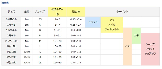 サイズ:1号/4lb 全長:1m スナップ:S 推奨ルアー(g):1−7 適合PE:0.15-0.4 入数:3 ※実物と色が違って見える場合があります。あらかじめご了承下さい。
