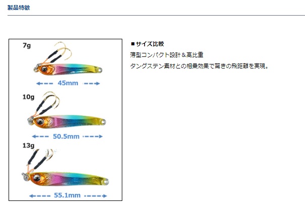 プリズナーTGを太軸金針搭載の大物仕様に。沖に潜むデカアジ・デカメバルを狙い撃て!飛びのタングステンジグ!薄型コンパクト設計&高比重タングステン素材との相乗効果で驚きの飛距離を実現。今まで届かなかった沖に潜むデカアジ・デカメバルを狙い撃ちすることが可能となった。形状は非対称センターバランスで、フリーフォールの状態ではヒラヒラと舞うスローフォールを演出。また、薄型ボディが潮流に乗り、強烈なスライドアクションを発生させターゲットを魅了する。アシストフックはティンセル付き太軸金針を採用したハイアピール&高強度仕様。ショゴやワカシなどの小型回遊魚にも対応する。