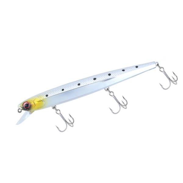 ジャークし続けても疲れにくい!ぶっ飛び!シーバス、サワラ、タチウオゲームで威力を発揮する、ジャーキング専用ミノー。■使い方 基本的な操作は、ロッドティップを下向きに煽るイメージで1シャクリハンドル1回巻きのショートジャークをリズミカルに繰り返すだけ。 表層を引きたい時はキャスト後すぐにジャークを開始、中〜低層を引きたい時は着水後カウントダウンして狙いの層まで沈めてからジャークに移行すれば良い。 ※ジャーキング専用の為、タダ巻きでは弱いウォブンロールアクションとなります。