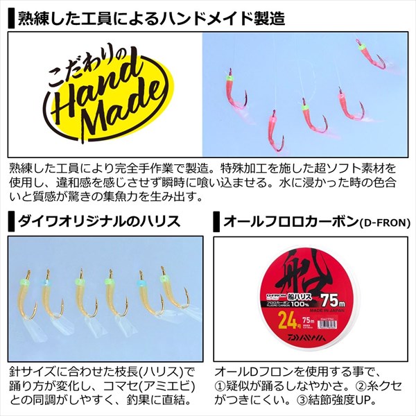 徹底的釣果主義にこだわったサビキ、それが快適職人サビキ。職人サビキの大きな特徴は下記の5つ。■完全手作業による製造(HAND MADE)■釣果に直結する針カラーの採用。疑似の種類・特徴に合わせてオリジナル針カラーをセレクト。■オールフロロカーボン(D-FRON)使用。擬餌が踊るしなやかさ・糸グセがつきにくいコシ・結節強度重視設計。■擬餌が踊る枝長(ハリス)の設計。針サイズに合わせた独自の枝長(ハリス)をセレクト。■針サイズに合わせた擬餌の長さ・太さ(幅)設計※掲載している商品の画像は代表画像を表示しています。また実物と色が違って見える場合があります。あらかじめご了承下さい。