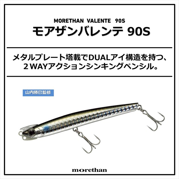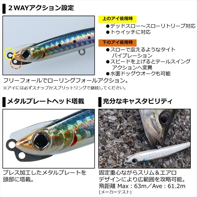 山内勝己監修。1年中活躍する多芸多才なスリムシンペン。メタルプレート塔載でDUAL(2つ)アイ構造を持つ、2WAYアクションシンペン。1つのルアーで2つのアクションを演出。上のアイ使用時:デッドスロー〜スローリトリーブ対応でスローピッチワイドスイング。トゥイッチでライントラブルほぼ無くフラッタリングイレギュラーダートを発生し、(平ウチしながらダート)食わせの間を作れる。下のアイ使用時:スローで震えるようなタイトバイブレーション。スピードを上げるとテールスイングアクションへ変異。