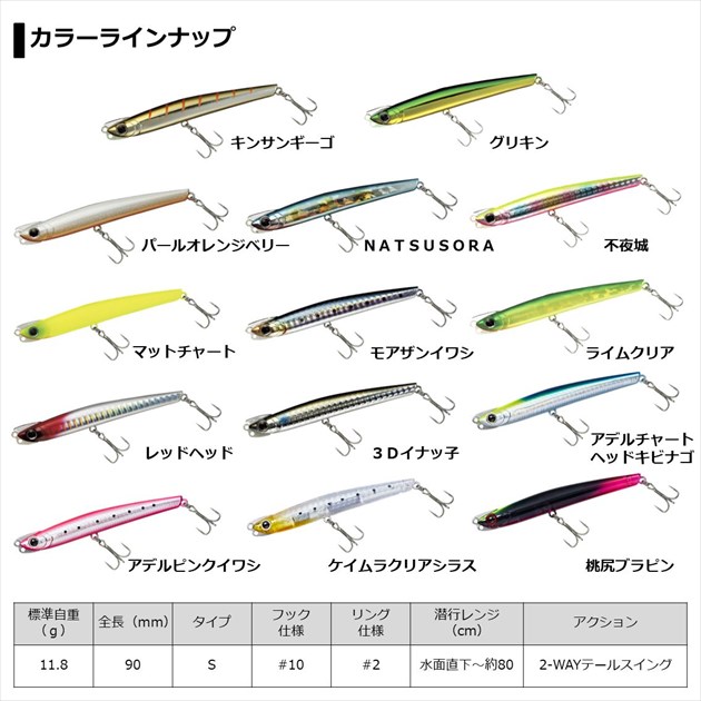カラー:桃尻ブラピン サイズ(mm):90 標準自重(g):11.8 標準装備フック:10トレブル #2リング ※実物と色が違って見える場合があります。あらかじめご了承下さい。