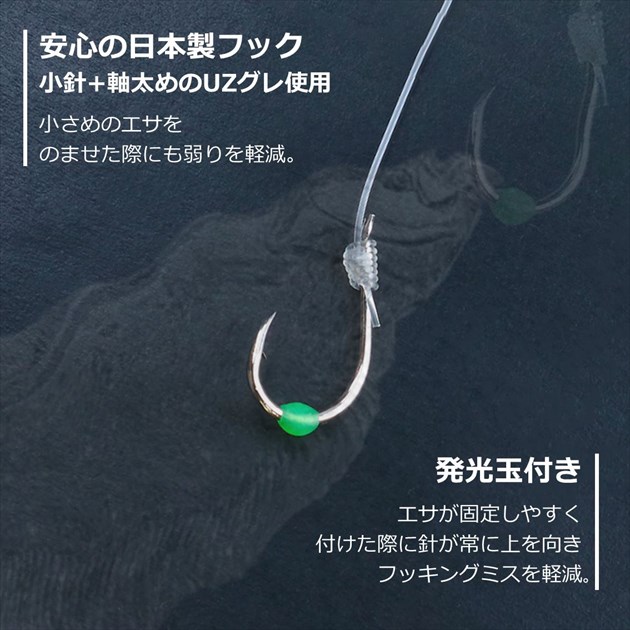 基本性能を満たしていながらにコストパフォーマンスに優れた仕掛けシリーズ それが快適堤防のませ仕掛けLBG ■安心の日本製フック(小針+軸太めのUZグレ使用)小さめのエサをのませた際にも弱りを軽減 ■オールフロロカーボン(Dフロン)使用※ステ糸はナイロン ■エサ固定しやすくする為の発光玉付き。エサを付けた際に、針が常に上を向きフッキングミスを軽減
