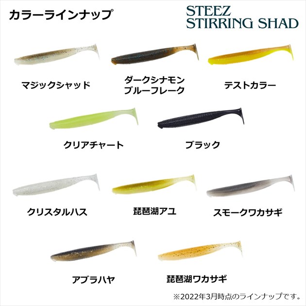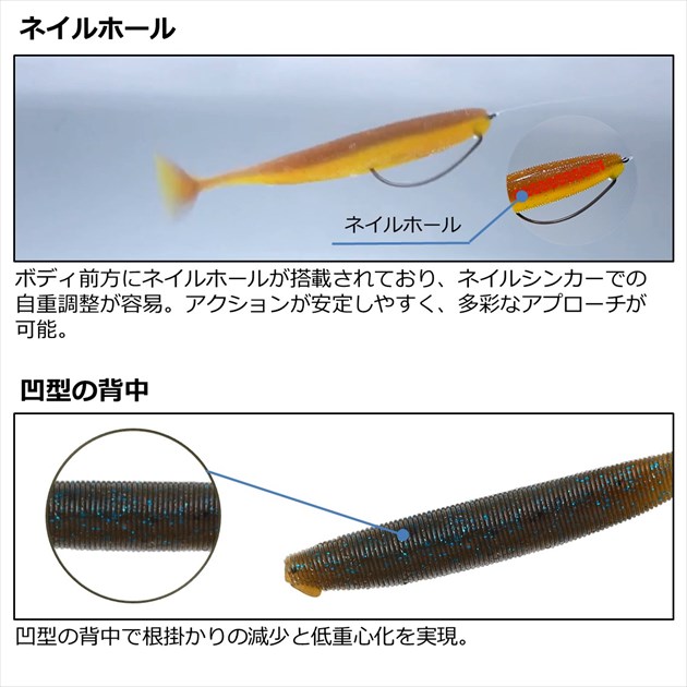 釣れる要素を凝縮したスタンダードシャッドテールワーム。クリアからマッディまで幅広く使えるスタンダードなシャッドテールワーム。弱すぎず、強すぎない絶妙なパワーのアクションは、ダウンショットやノーシンカー、スイムジグのトレーラーなどリグを選ばず、多彩に使うことが可能。ネイルシンカーを挿入するネイルホールも搭載し、アクションの安定性やスキッピング性能の向上を狙ったウエイト調整が可能。