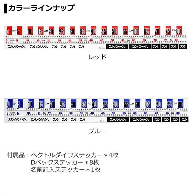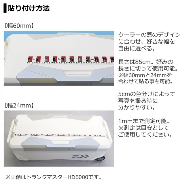 5cmごとに色分けされて見やすいメジャーステッカー●クーラーのフタのデザインに合わせて選べるよう、縦幅約60mmと約24mmの2種類をラインナップ。横幅はどちらも最大44cmで、好みの長さに切って使ってもOK。また大型サイズのクーラーに貼る場合、2枚を並べれば最大88cmまで計ることが可能。●5cmごとに色分けされた目盛り部&デカ文字で写真を撮る時にもサイズがはっきりと分かる。コンテスト等に応募する写真を撮る際にも最適。目盛りは最小1mmまで設定。■名前が記入できるステッカー&ダイワロゴステッカーも付属。※掲載している商品の画像は代表画像を表示しています。また実物と色が違って見える場合があります。あらかじめご了承下さい。