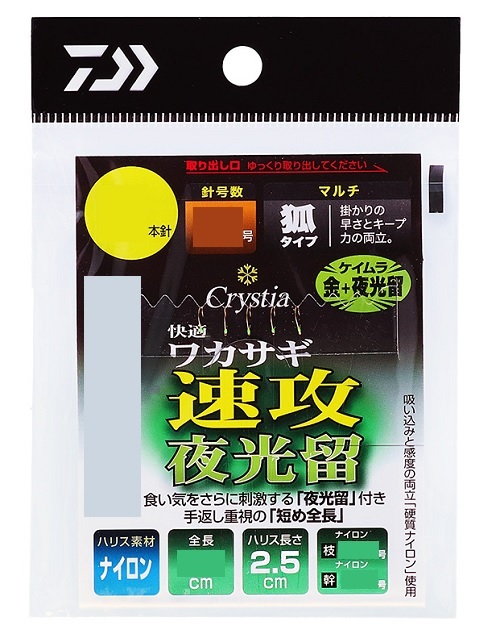 久保田稔監修、ショート&細ハリスで手返し重視の速攻ワカサギ仕掛け。水の色が暗い時はこれ!濁り時や曇り時に有効な「夜光留」付き。手返し重視の短め全長。