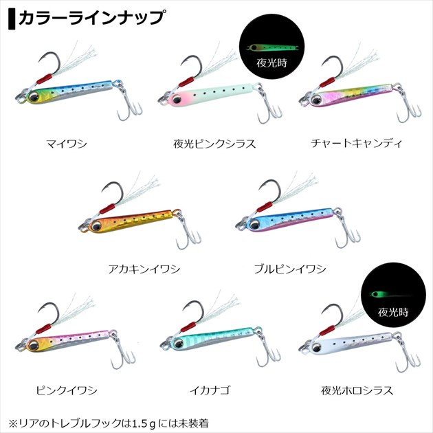 定番ジグ「プリズナー」がSaqSasアシストフックに強力発光ティンセルをまとってリニューアル!メバル、アジのみならずカサゴやメッキ、カマス、ショゴなどの小型回遊魚も狙える万能ジグ「プリズナー」が、SaqSasアシストフックに強力発光グローティンセルをまとってリニューアル。濁り潮やナイトゲームでもターゲットにしっかりとアピールする。また、リアにはトレブルフックを標準装備(1.5gを除く)。低活性時のじゃれつくようなアタリもフッキングに持ち込むことが可能。