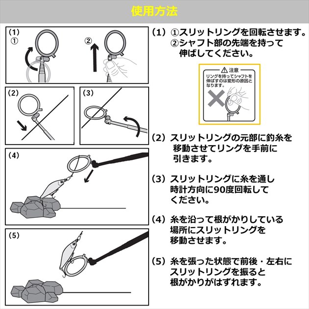 大事なルアーを回収!!これ一本で根がかりトラブル解消。川の中の岩や流木の隙間に挟まれなど根掛かり時にこの一本でルアーロス解消!また、水中だけではなく木の枝に引っ掛かる時にトラブル解消可能。水中で見やすい蛍光イエローカラー先端。シャフト部にスリット加工をする事で水圧(流れ)によるシャフトの回転がしにくく、根掛りトラブル解消に便利。リング部は折り畳み可能でコンパクトに!ベストのポケットに収納可能(胸ポケットのサイズにより収納できない場合がある)スプリットリングを尻手ロープ穴に通せば、紛失防止の尻手ロープの取り付けが可能、またカラビナを取り付ければベストのDカンにも取り付け可能。